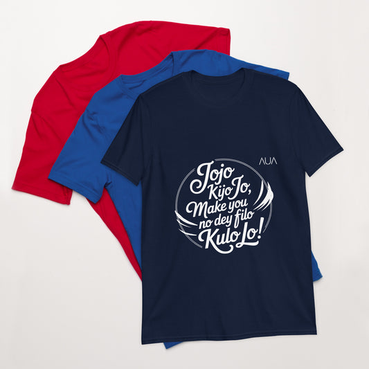 AUA® Jojo Kijo Jo Make You No Dey Filo Kulo lo! (White Text) Short-Sleeve Unisex T-Shirt
